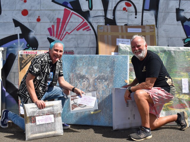 Phil Oakley and Mick Brennan in previous years unpacking Bundaberg Art Prize entries are excited to see what comes in this year. (Elka Scherer: 426864)