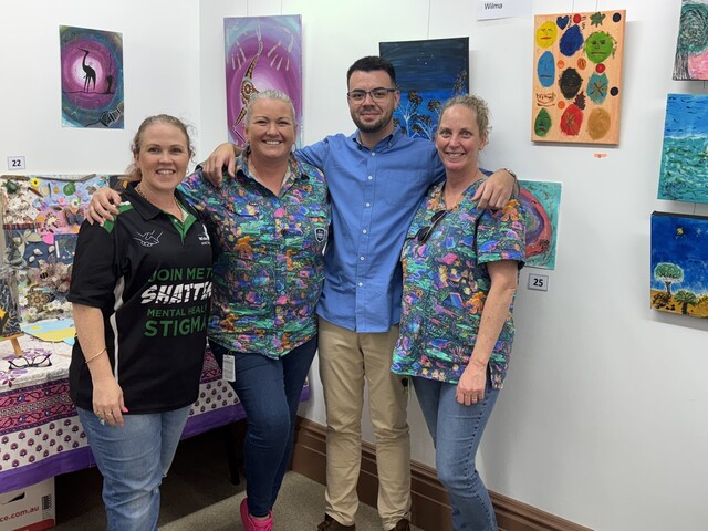 Proudly sharing The 2025 Mental Health Week Art Exhibition were Jade Law, Victoria Campbell, Jesse Tree, Kim Mathews (Wide Bay Community Mental Health staff viewing the art).
