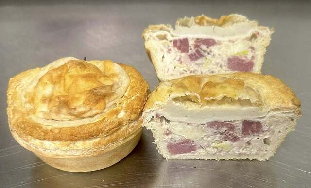 Pie of the Month is a popular addition to Gin Gin Bakery's social media - this is corned beef with white sauce and cabbage pie with a golden potato top.